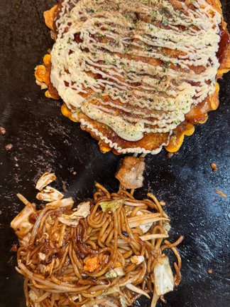 Okonomiyaki: una especie de tortilla japonesa con masa, repollo y diferentes ingredientes. Para una experiencia auténtica te recomendamos el restaurante あまから亭 (Amakara-tei), que también ofrece deliciosos yakisoba.