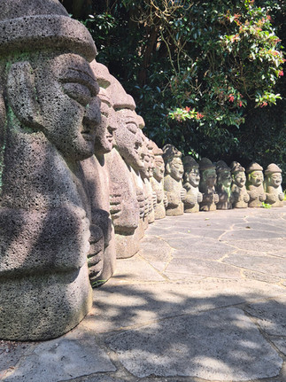 En el ingreso a las cascadas te encontrarás con una serie de esculturas de los abuelos de Jeju, algo muy icónico de la isla